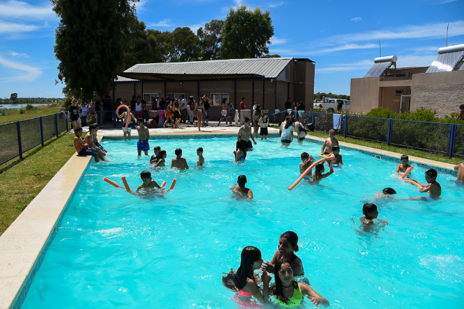 Acompañado por el intendente Javier Gastón y funcionarios locales, Sileoni recorrió las instalaciones y dialogó con los estudiantes, quienes disfrutaban de un día de pileta.